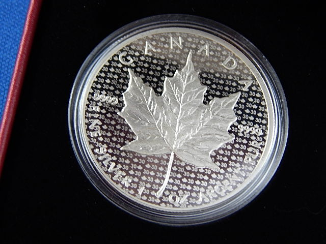 The reverse features the iconic Silver Maple Leaf bullion coin design. The field is filled with a laser-engraved pattern comprised of a maple leaf alongside the number "30".