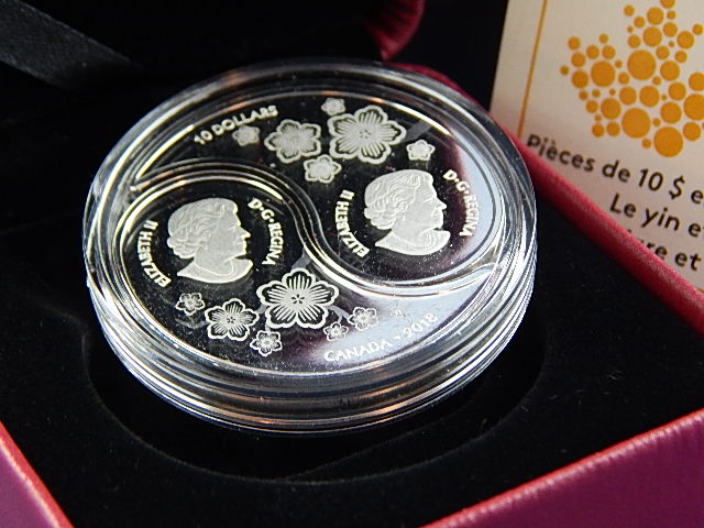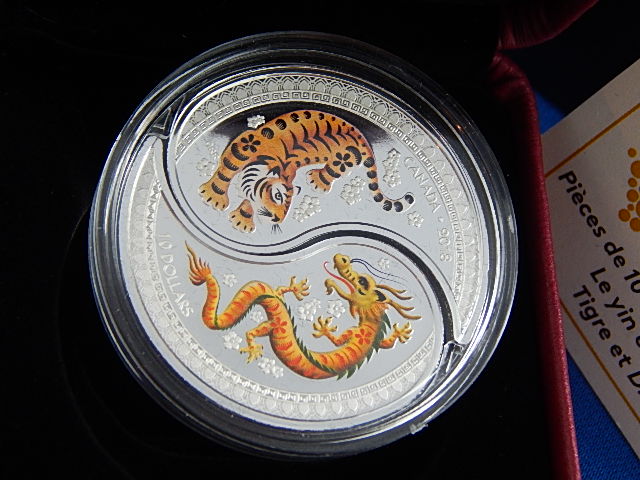 The reverse images include a Tiger on one coin and a Dragon on the other, featured in selective colouring, and surrounded by cherry blossoms. The Tiger coin is shaped to form the traditional Chinese yin symbol, and the Dragon coin is shaped in the form of the yang symbol. The design was by Three Degrees Creative Group.