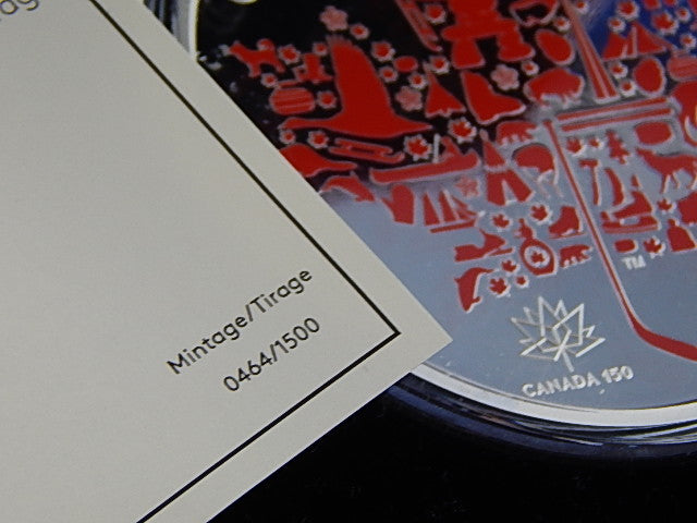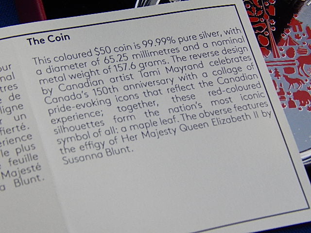 The reverse celebrates Canada's 150th anniversary with a collage of pride-evoking icons that reflect the Canadian experience. These red coloured silhouettes form the nation's most iconic symbol of all - a maple leaf.