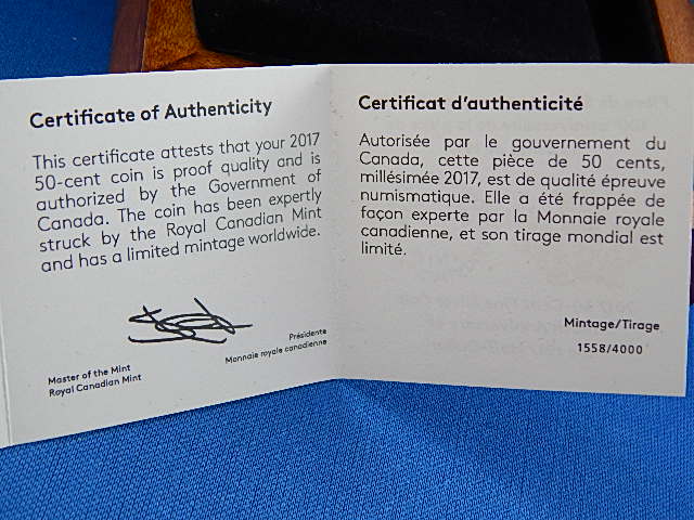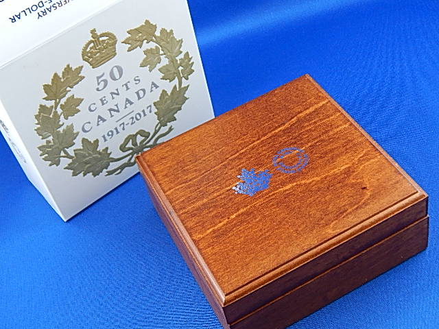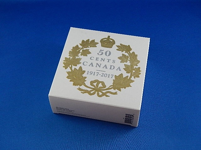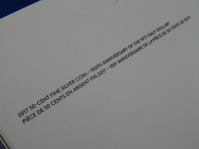 The reverse recreates the original design which graced Canada's 50 cent coins before 1937. Originally designed by L.C. Wyon and later modified by W.H.J. Blakemore. It also reflects the commemorative coin showing "1917-2017".