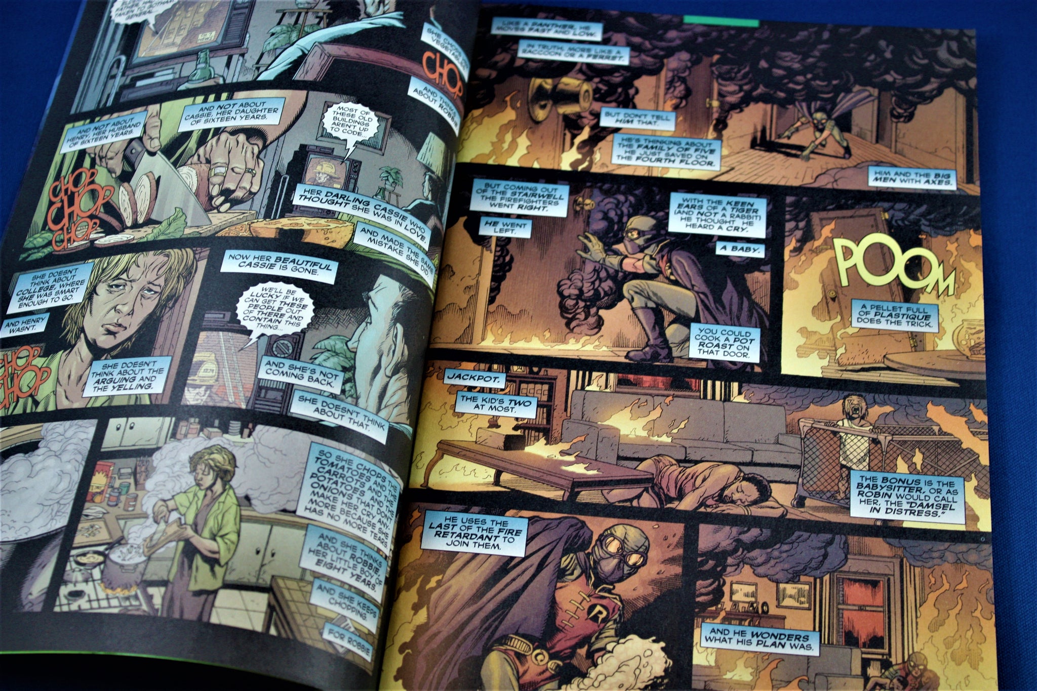 The Gotham City Fire Department tries their best to rescue all the people trapped inside the burning building in Park Row, while they also try to contain the fire from spreading, but there is still too many people that won't be saved unless someone else joins the rescuing efforts. Robin gets inside the building, wearing a special suit to resist the fire that is consuming the place. Soon, he locates a baby and a girl trapped on one of the apartments and without wasting any time, he takes them away from the fire just when the building starts collapsing, piece by piece.