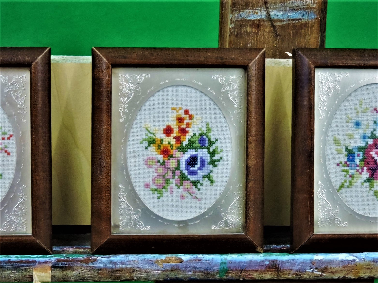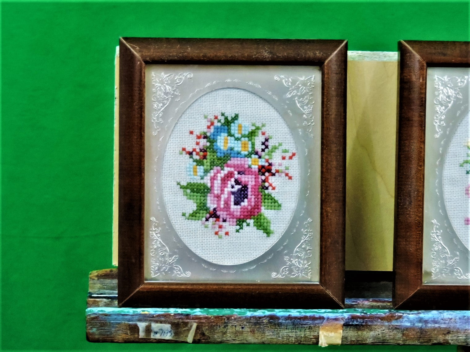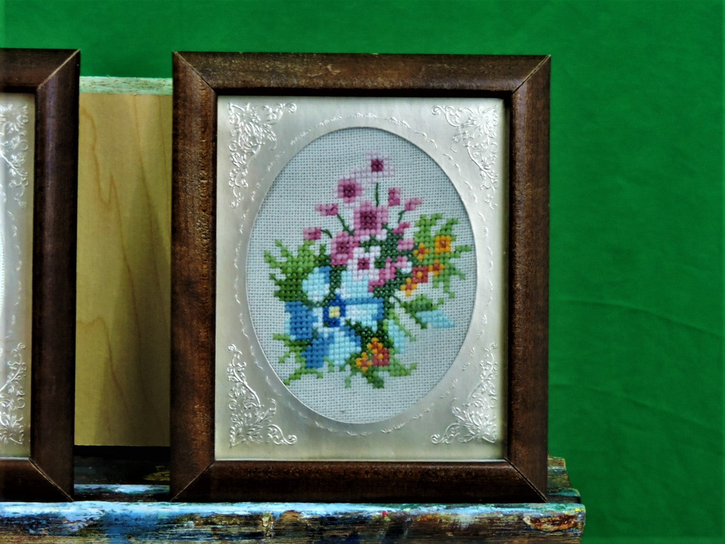 These are handmade Cross-stitch floral pictures.  They are great condition with no damage but wooden frames have a bit of wear. The colors are pastel.  These cross-stitch florals are finished and framed in matching wood frames.