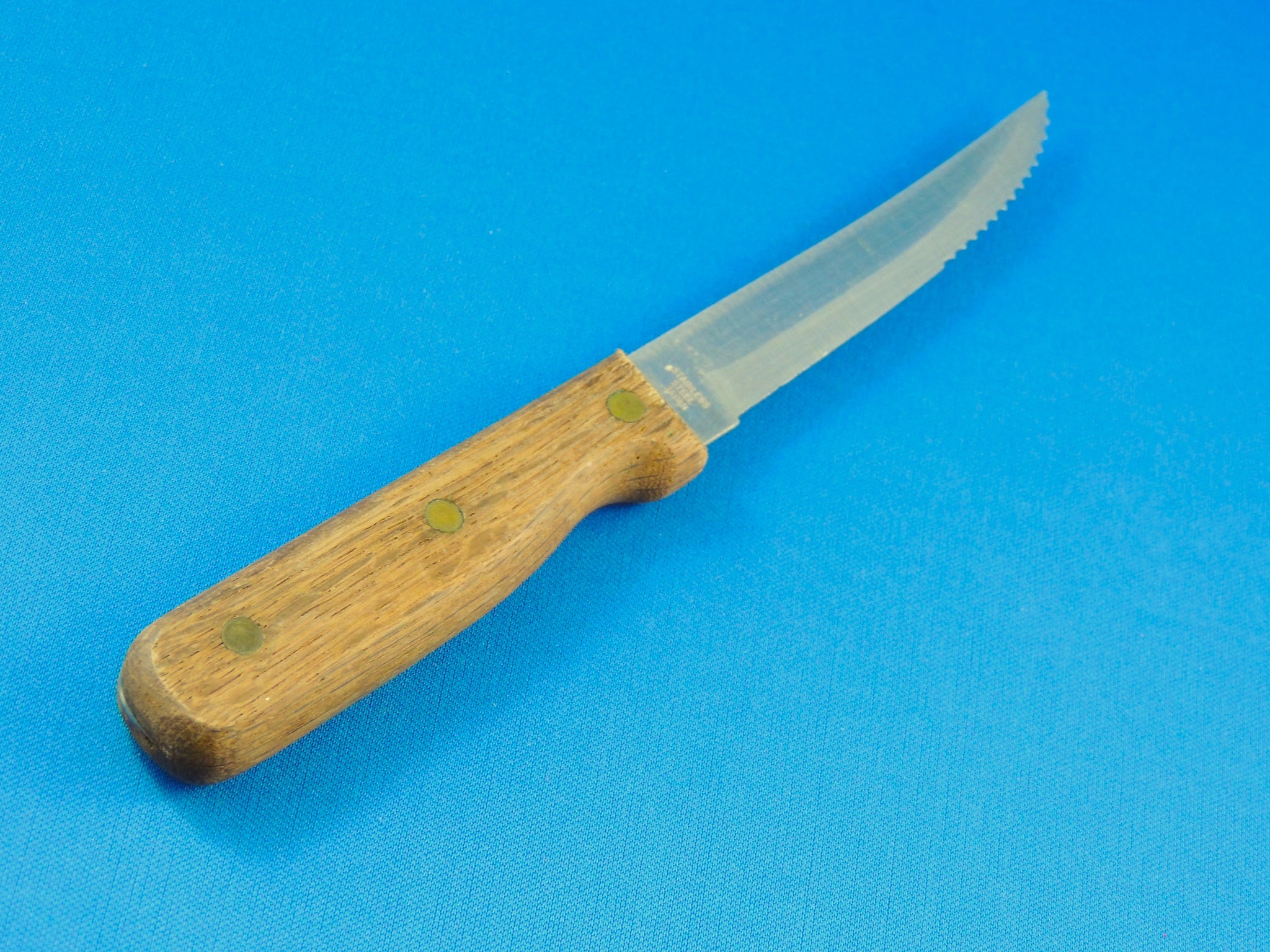 The half serrated stainless steel blade is 4 3/8" with a wood handle.