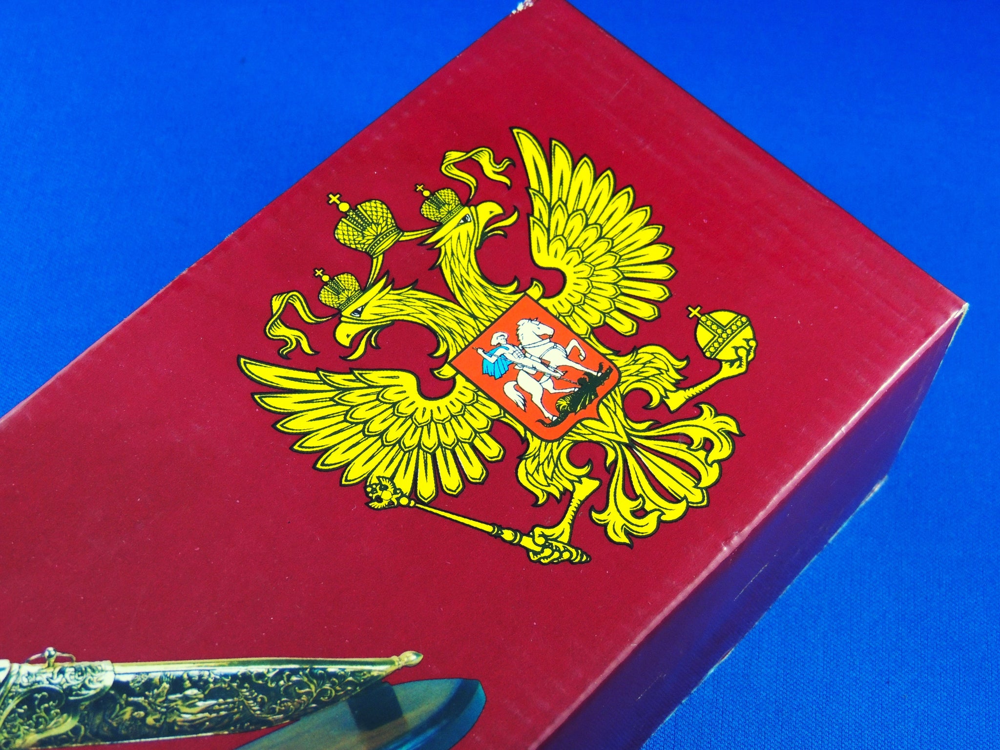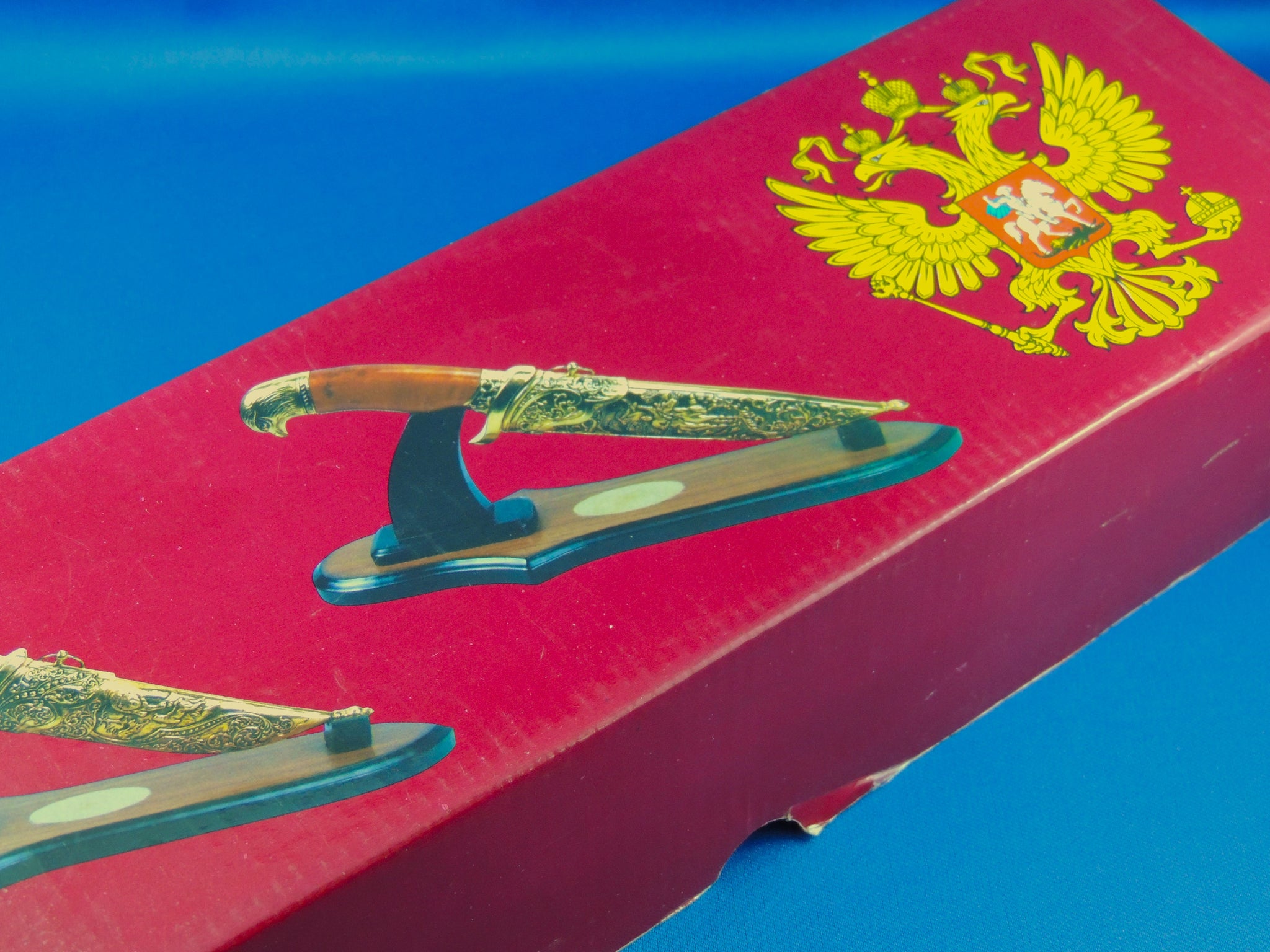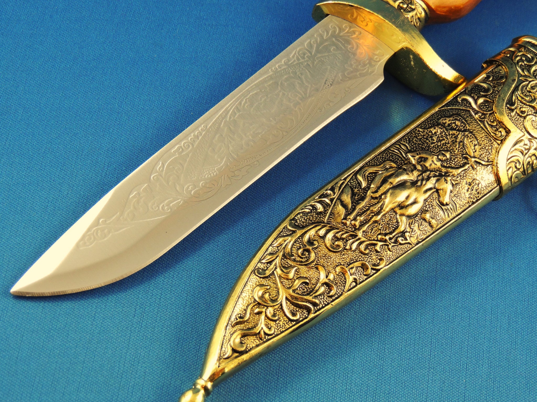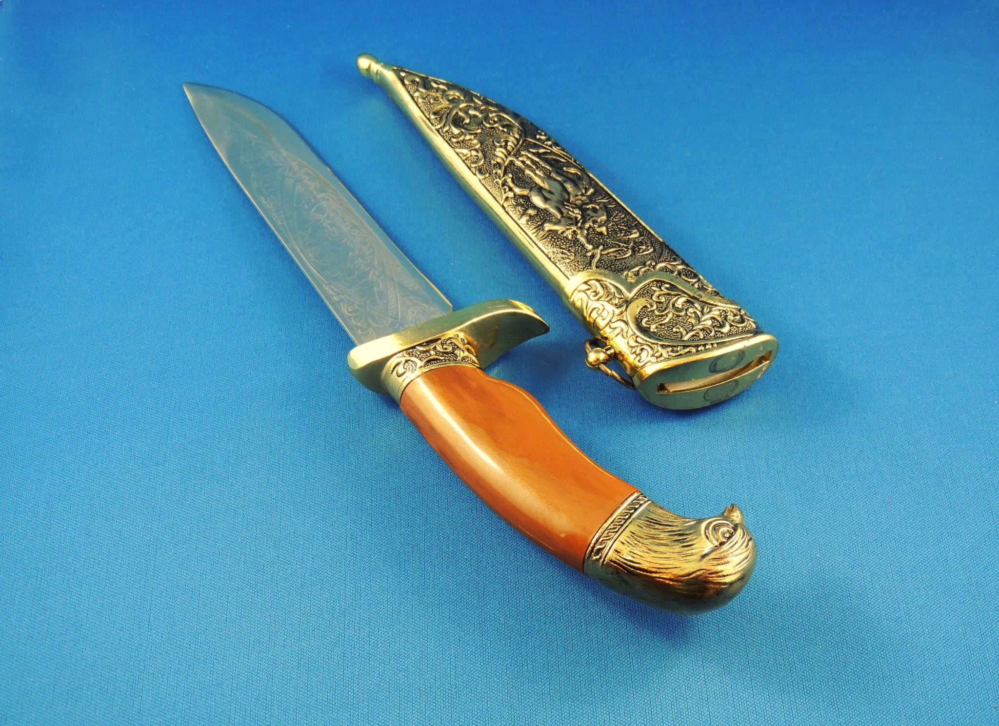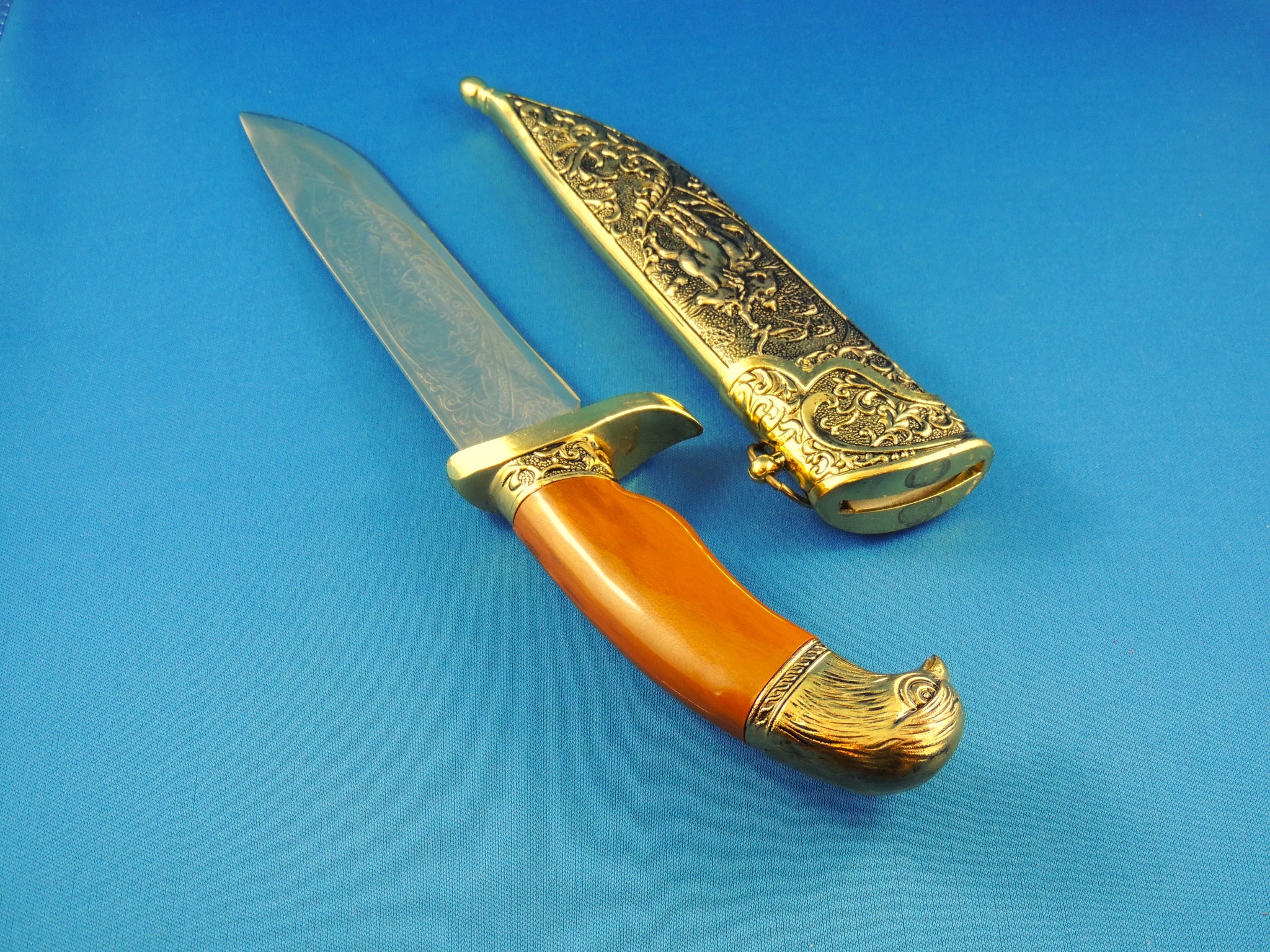 KE012. Comes with stand, decorative sheath and knife with designs on blade.