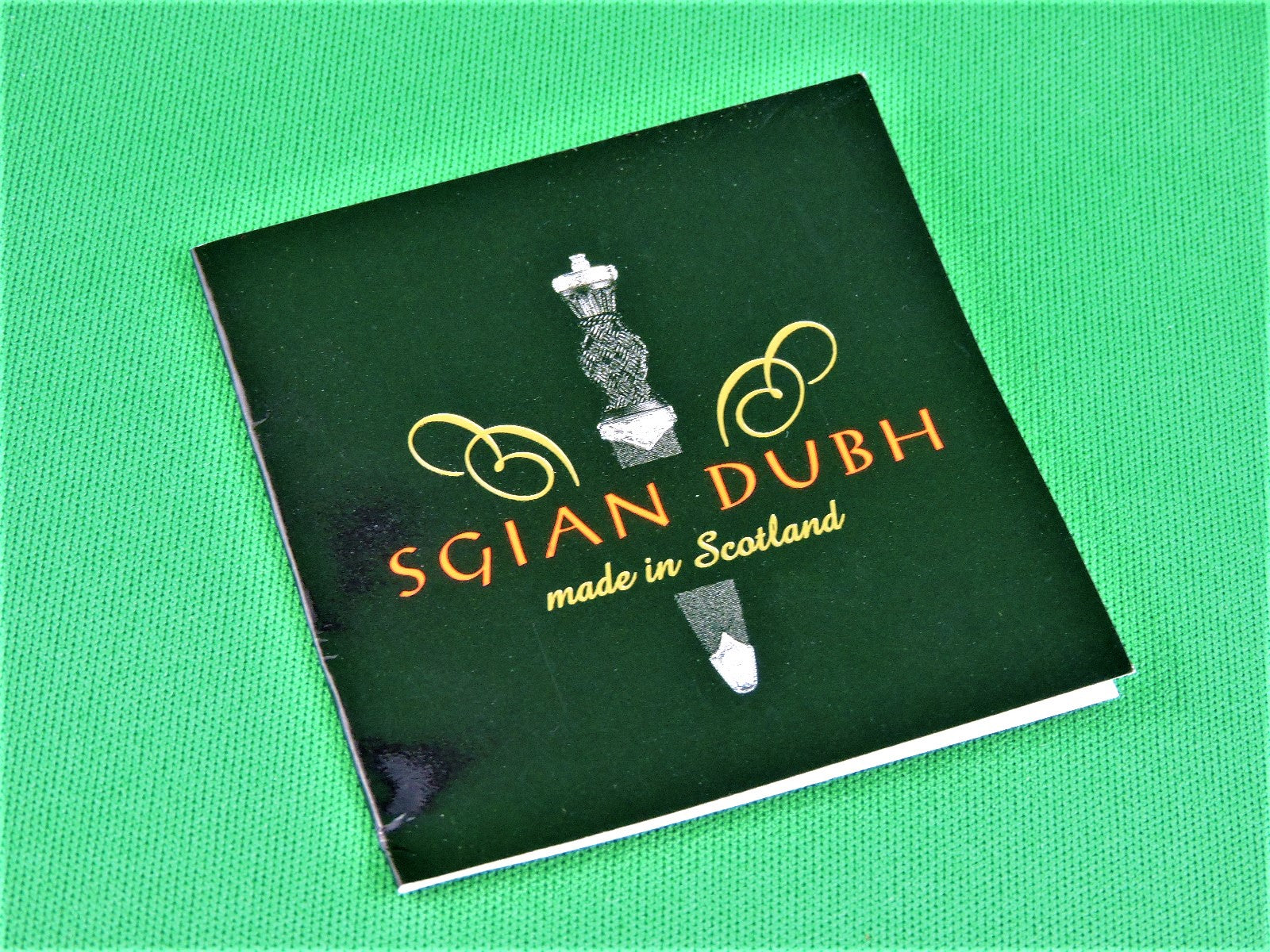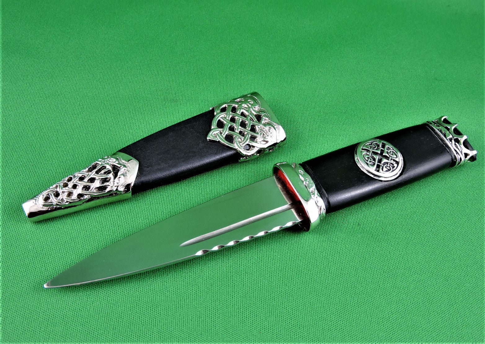 This knife is traditionally worn in the top of the stocking by the Highlander. The flat edge is normally worn in the right stocking by right handed people. The name is Gaelic - The word sgian means knife or dagger and dubh means black, referring to the colour of the handle, which was made from black hardwood.